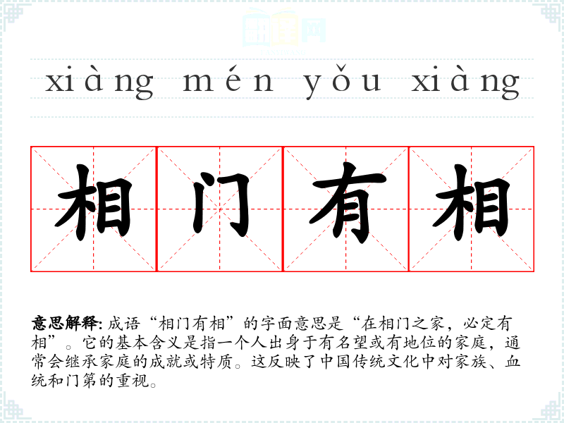 成语“相门有相”的字面意思是“在相门之家,必定有相”。它的基本含义是指一个人出身于有名望或有地位的家庭,通常会继承家庭的成就或特质。这反映了**传统文化中对家族、血统和门第的重视。