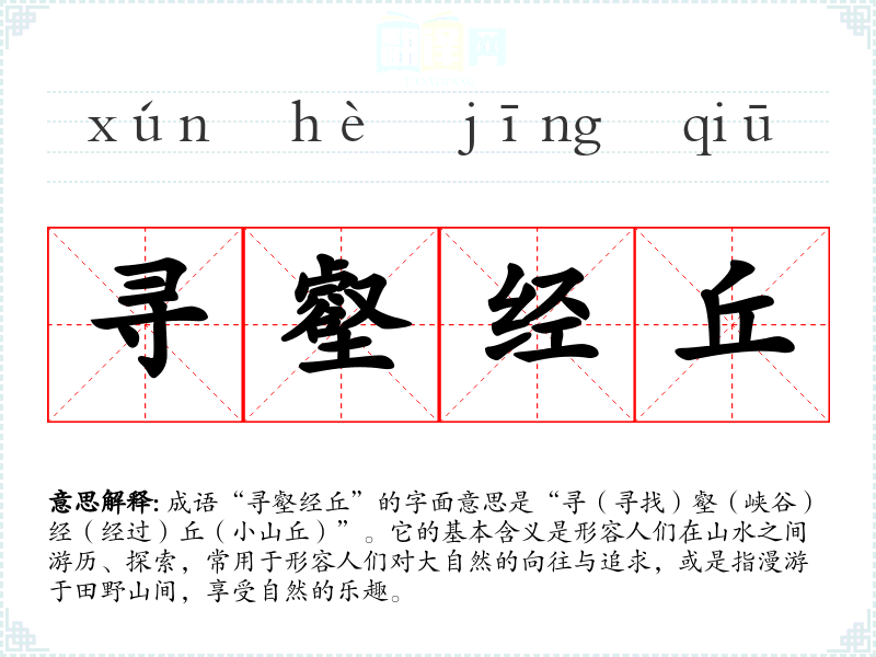 成语“寻壑经丘”的字面意思是“寻(寻找)壑(峡谷)经(经过)丘(小山丘)”。它的基本含义是形容人们在山水之间游历、探索,常用于形容人们对大自然的向往与追求,或是指漫游于田野山间,享受自然的乐趣。