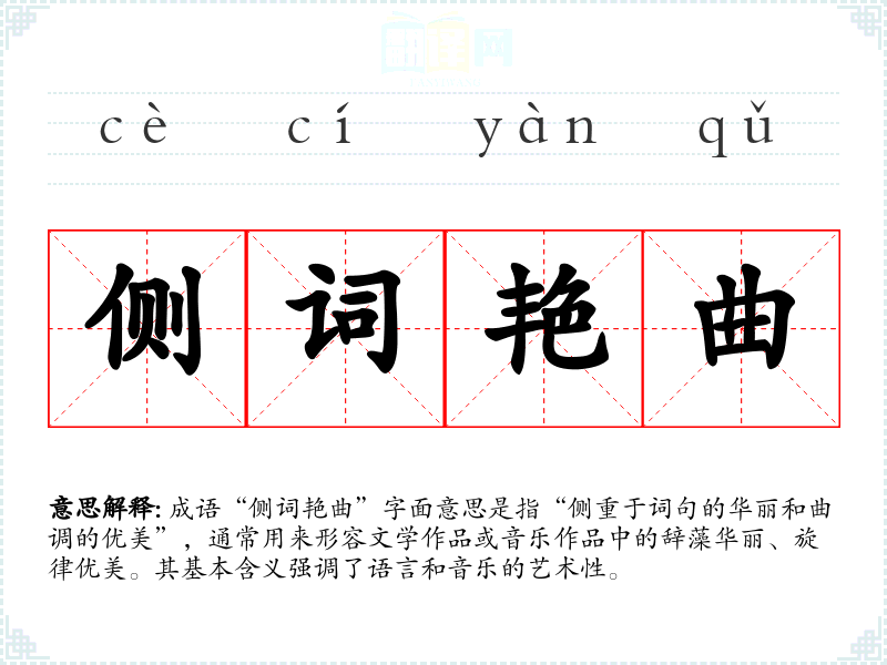 成语“侧词艳曲”字面意思是指“侧重于词句的华丽和曲调的优美”,通常用来形容文学作品或音乐作品中的辞藻华丽、旋律优美。其基本含义强调了语言和音乐的艺术性。
