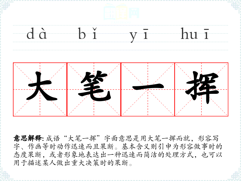 在**传统文化中,书法和绘画被视为高雅艺术,代表了个人的修养与气质。“大笔一挥”不仅体现了艺术创作的潇洒与自信,也反映了社会对果断决策能力的重视。在现代社会,尤其在商业和政治领域,果断的决策被广泛推崇,因此该成语在现代语境中依然具有重要的适用性。