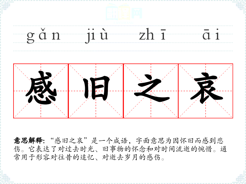 “感旧之哀”是一个成语,字面意思为因怀旧而感到悲伤。它表达了对过去时光、旧事物的怀念和对时间流逝的惋惜。通常用于形容对往昔的追忆、对逝去岁月的感伤。