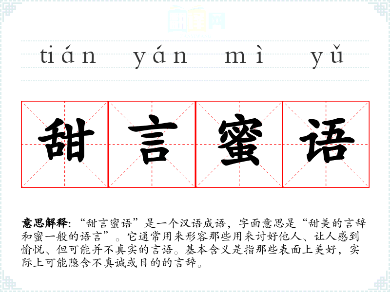 “甜言蜜语”是一个汉语成语,字面意思是“甜美的言辞和蜜一般的语言”。它通常用来形容那些用来讨好他人、让人感到愉悦、但可能并不真实的言语。基本含义是指那些表面上美好,实际上可能隐含不真诚或目的的言辞。