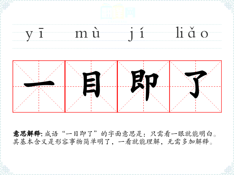 成语“一目即了”的字面意思是:只需看一眼就能明白。其基本含义是形容事物简单明了,一看就能理解,无需多加解释。