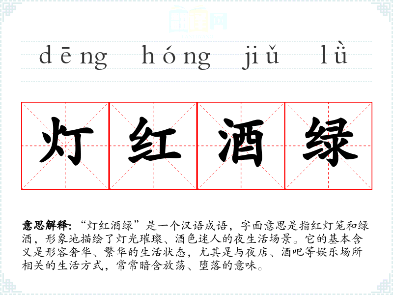 “灯红酒绿”是一个汉语成语,字面意思是指红灯笼和绿酒,形象地描绘了灯光璀璨、酒色迷人的夜生活场景。它的基本含义是形容奢华、繁华的生活状态,尤其是与夜店、酒吧等娱乐场所相关的生活方式,常常暗含放荡、堕落的意味。