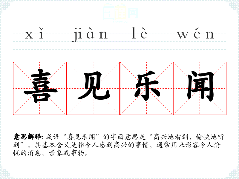 成语“喜见乐闻”的字面意思是“高兴地看到,愉快地听到”。其基本含义是指令人感到高兴的事情,通常用来形容令人愉悦的消息、景象或事物。