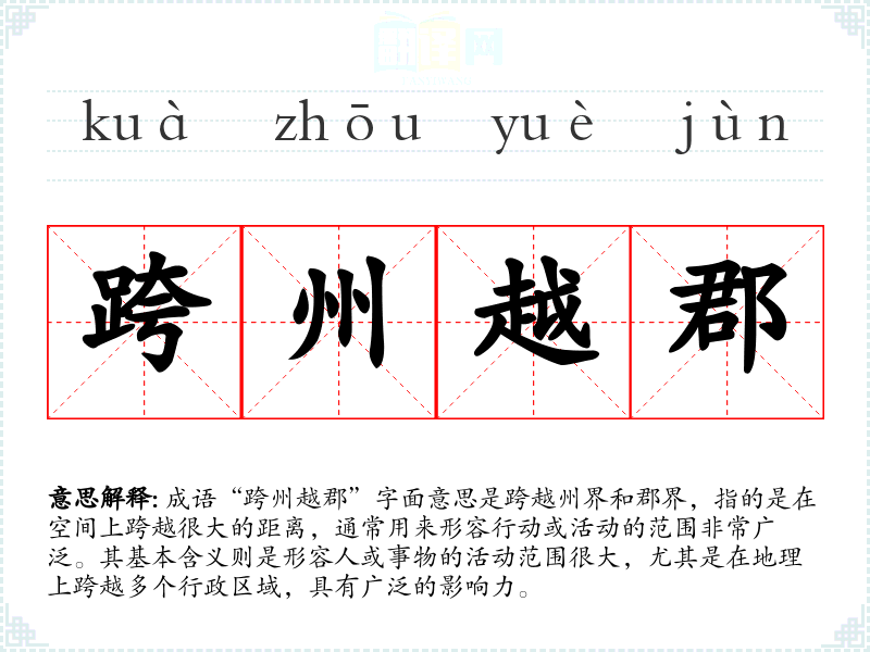 成语“跨州越郡”字面意思是跨越州界和郡界,指的是在空间上跨越很大的距离,通常用来形容行动或活动的范围非常广泛。其基本含义则是形容人或事物的活动范围很大,尤其是在地理上跨越多个行政区域,具有广泛的影响力。
