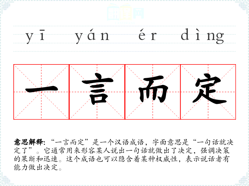 “一言而定”是一个汉语成语,字面意思是“一句话就决定了”。它通常用来形容某人说出一句话就做出了决定,强调决策的果断和迅速。这个成语也可以隐含着某种权威性,表示说话者有能力做出决定。