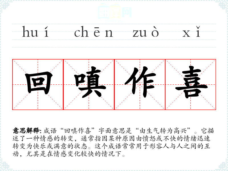 成语“回嗔作喜”字面意思是“由生气转为高兴”。它描述了一种情感的转变,通常指因某种原因由愤怒或不快的情绪迅速转变为快乐或满意的状态。这个成语常常用于形容人与人之间的互动,尤其是在情感变化较快的情况下。