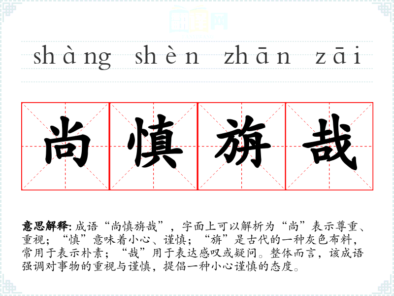 成语“尚慎旃哉”,字面上可以解析为“尚”表示尊重、重视;“慎”意味着小心、谨慎;“旃”是古代的一种灰色布料,常用于表示朴素;“哉”用于表达感叹或疑问。整体而言,该成语强调对事物的重视与谨慎,提倡一种小心谨慎的态度。