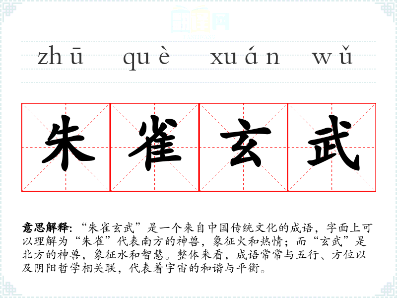 “朱雀玄武”是一个来自**传统文化的成语,字面上可以理解为“朱雀”代表南方的神兽,象征火和热情;而“玄武”是北方的神兽,象征水和智慧。整体来看,成语常常与五行、方位以及阴阳哲学相关联,代表着宇宙的和谐与平衡。