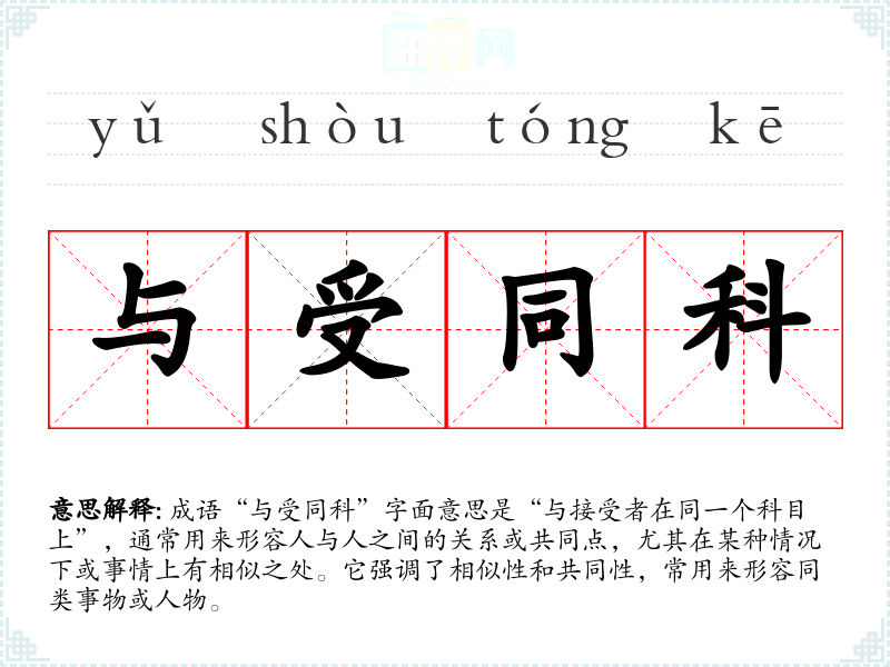 成语“与受同科”字面意思是“与接受者在同一个科目上”,通常用来形容人与人之间的关系或共同点,尤其在某种情况下或事情上有相似之处。它强调了相似性和共同性,常用来形容同类事物或人物。