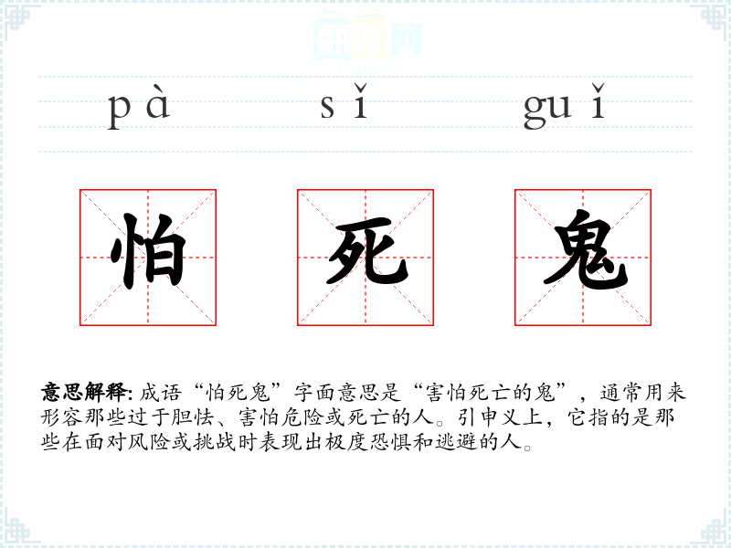 成语“怕死鬼”字面意思是“害怕死亡的鬼”,通常用来形容那些过于胆怯、害怕危险或死亡的人。引申义上,它指的是那些在面对风险或挑战时表现出极度恐惧和逃避的人。