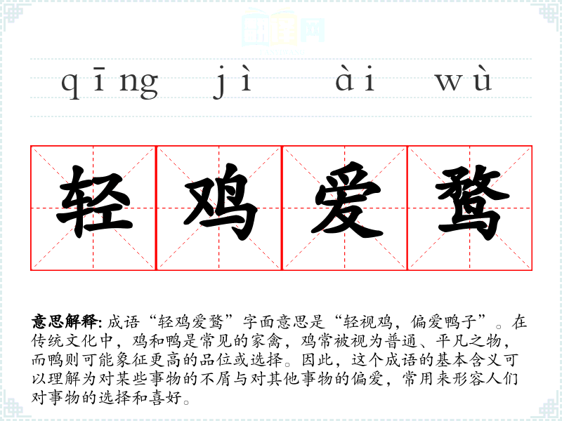 成语“轻鸡爱鹜”字面意思是“轻视鸡,偏爱鸭子”。在传统文化中,鸡和鸭是常见的家禽,鸡常被视为普通、平凡之物,而鸭则可能象征更高的品位或选择。因此,这个成语的基本含义可以理解为对某些事物的不屑与对其他事物的偏爱,常用来形容人们对事物的选择和喜好。