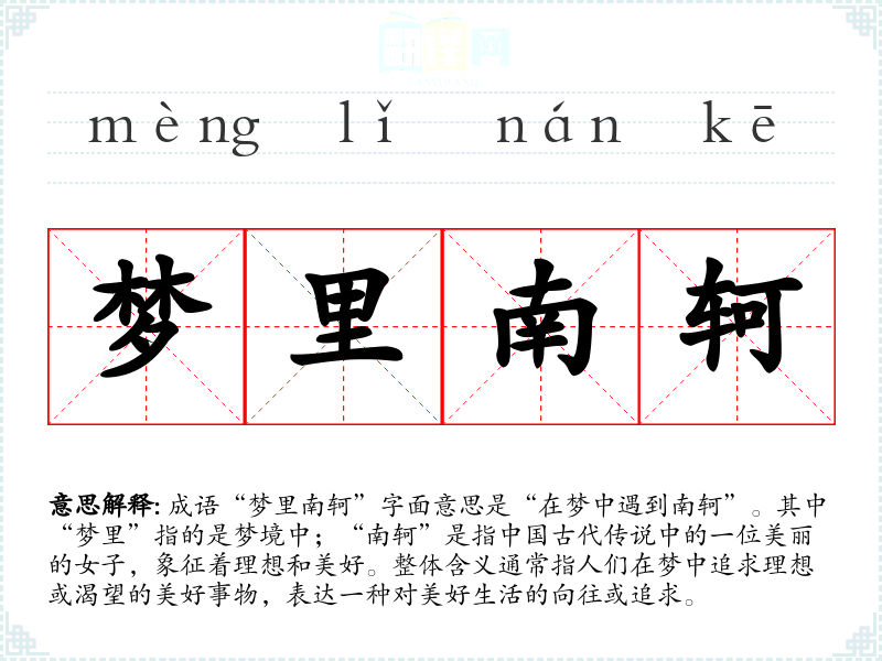 成语“梦里南轲”字面意思是“在梦中遇到南轲”。其中“梦里”指的是梦境中;“南轲”是指**古代传说中的一位美丽的女子,象征着理想和美好。整体含义通常指人们在梦中追求理想或渴望的美好事物,表达一种对美好生活的向往或追求。