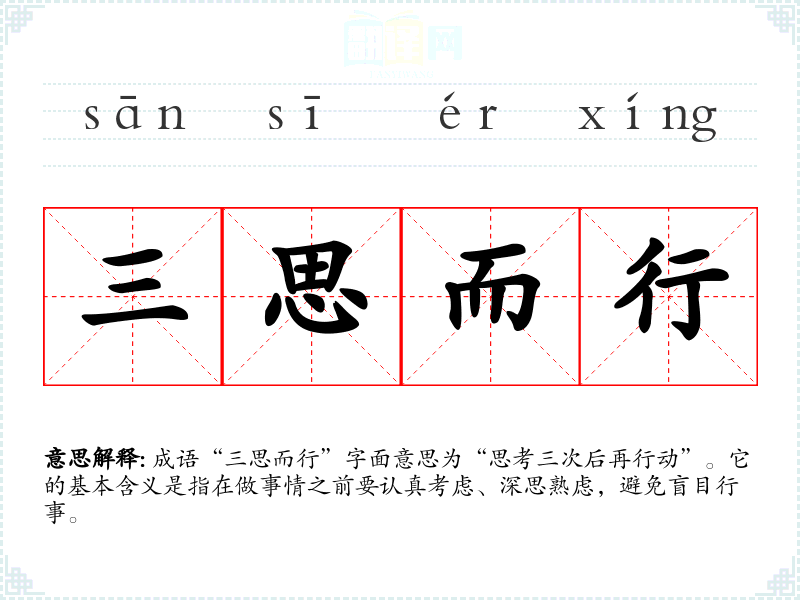 成语“三思而行”字面意思为“思考三次后再行动”。它的基本含义是指在做事情之前要认真考虑、深思熟虑,避免盲目行事。