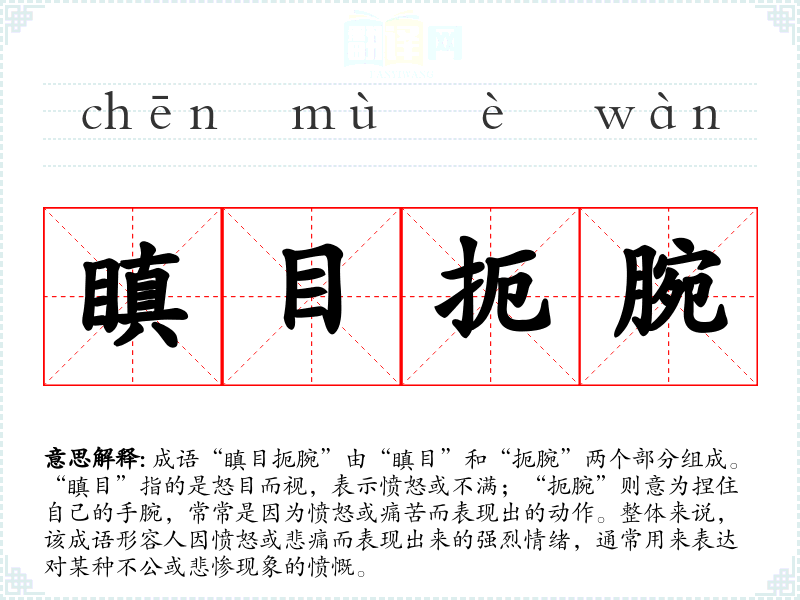 成语“瞋目扼腕”由“瞋目”和“扼腕”两个部分组成。“瞋目”指的是怒目而视,表示愤怒或不满;“扼腕”则意为捏住自己的手腕,常常是因为愤怒或痛苦而表现出的动作。整体来说,该成语形容人因愤怒或悲痛而表现出来的强烈情绪,通常用来表达对某种不公或悲惨现象的愤慨。