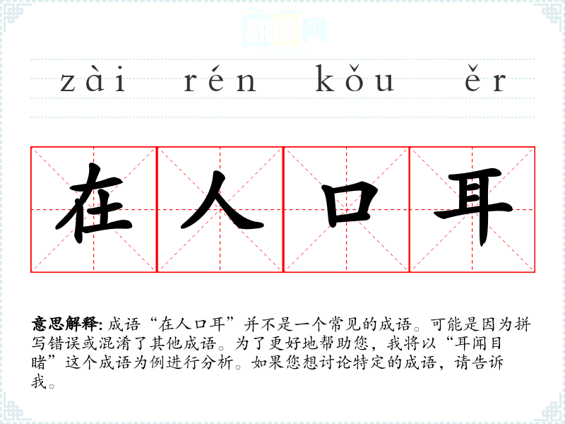 成语“在人口耳”并不是一个常见的成语。可能是因为拼写错误或混淆了其他成语。为了更好地帮助您,我将以“耳闻目睹”这个成语为例进行分析。如果您想讨论特定的成语,请告诉我。