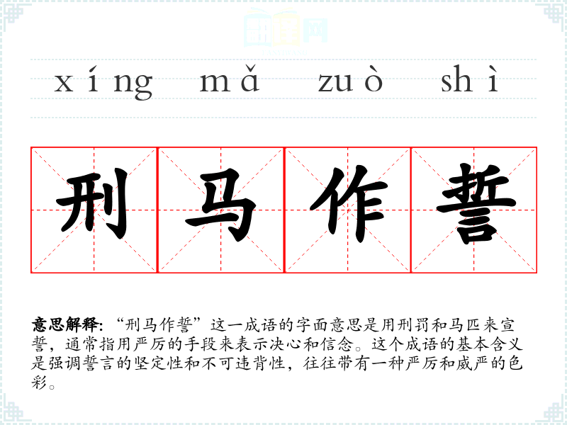 “刑马作誓”这一成语的字面意思是用刑罚和马匹来宣誓,通常指用严厉的手段来表示决心和信念。这个成语的基本含义是强调誓言的坚定性和不可违背性,往往带有一种严厉和威严的色彩。