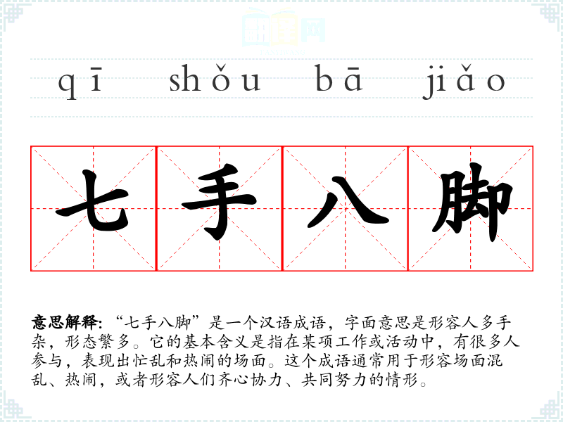 “七手八脚”是一个汉语成语,字面意思是形容人多手杂,形态繁多。它的基本含义是指在某项工作或活动中,有很多人参与,表现出忙乱和热闹的场面。这个成语通常用于形容场面混乱、热闹,或者形容人们齐心协力、共同努力的情形。