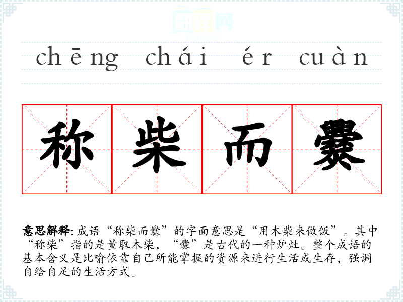 成语“称柴而爨”的字面意思是“用木柴来做饭”。其中“称柴”指的是量取木柴,“爨”是古代的一种炉灶。整个成语的基本含义是比喻依靠自己所能掌握的资源来进行生活或生存,强调自给自足的生活方式。