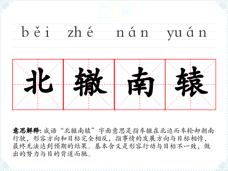 成语“北辙南辕”字面意思是指车辙在北边而车轮却朝南行驶,形容方向和目标完全相反,指事情的发展方向与目标相悖,最终无法达到预期的结果。基本含义是形容行动与目标不一致,做出的努力与目的背道而驰。