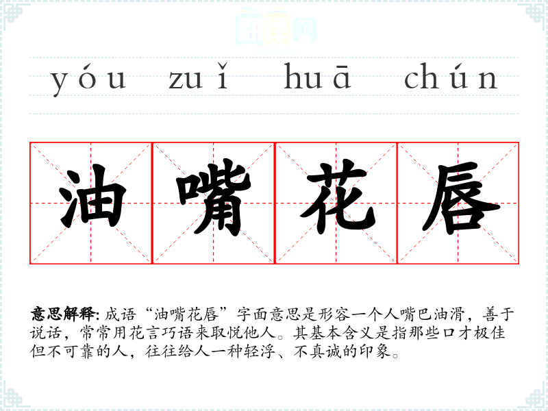 成语“油嘴花唇”字面意思是形容一个人嘴巴油滑,善于说话,常常用花言巧语来取悦他人。其基本含义是指那些口才极佳但不可靠的人,往往给人一种轻浮、不真诚的印象。