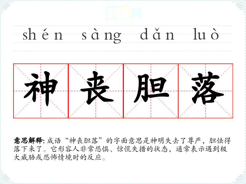 成语“神丧胆落”的字面意思是神明失去了尊严,胆怯得落下来了。它形容人非常恐惧、惊慌失措的状态,通常表示遇到极大威胁或恐怖情境时的反应。
