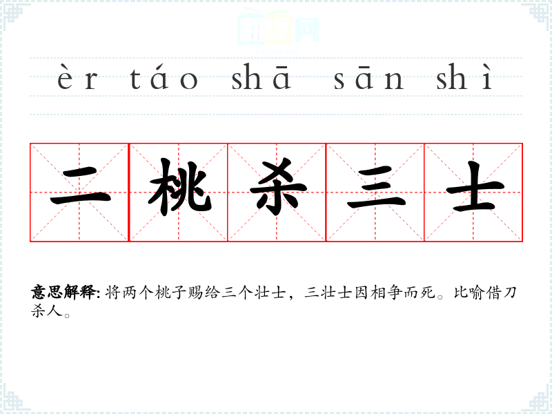 士:武士。春秋时齐景公将两个桃子赐给公孙接、田开疆、古冶子论功而食,三人弃桃自杀。比喻借刀杀人。 |