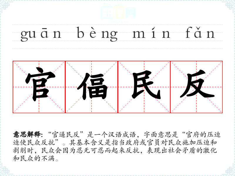“官逼民反”是一个汉语成语,字面意思是“官府的压迫迫使民众反抗”。其基本含义是指当政府或官员对民众施加压迫和剥削时,民众会因为忍无可忍而起来反抗,表现出社会矛盾的激化和民众的不满。