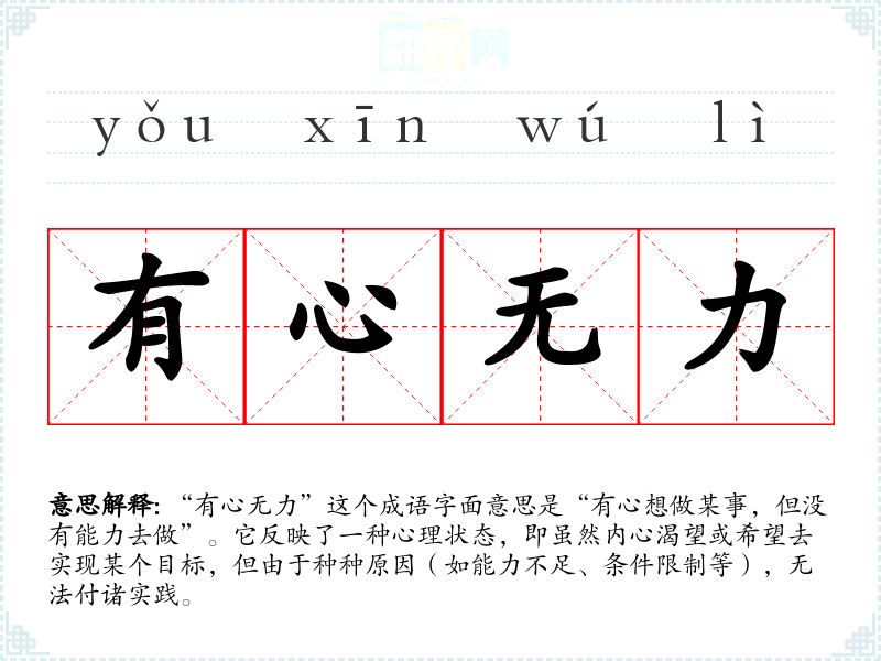 “有心无力”这个成语字面意思是“有心想做某事,但没有能力去做”。它反映了一种心理状态,即虽然内心渴望或希望去实现某个目标,但由于种种原因(如能力不足、条件限制等),无法付诸实践。