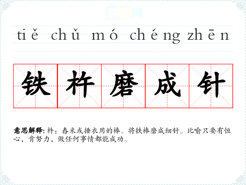 | 磨杵作针 | 形容只要肯下功夫,再难的事也能成。 |