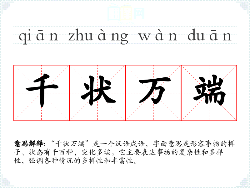 通过对“千状万端”的学,我认识到在生活中事物的复杂性与多样性是常态。这个成语不仅丰富了我的语言表达,也让我在面对复杂情况时,能够更好地理解和应对。它在我的语言学和表达中,具有重要的启示意义。