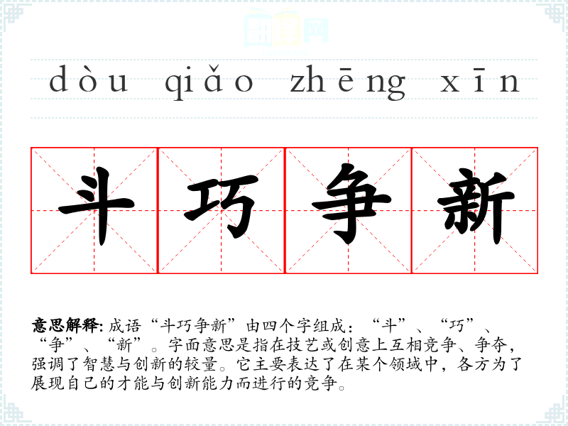 成语“斗巧争新”由四个字组成:“斗”、“巧”、“争”、“新”。字面意思是指在技艺或创意上互相竞争、争夺,强调了智慧与创新的较量。它主要表达了在某个领域中,各方为了展现自己的才能与创新能力而进行的竞争。