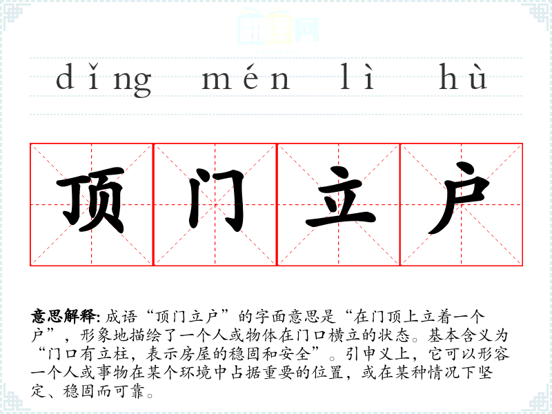 成语“顶门立户”的字面意思是“在门顶上立着一个户”,形象地描绘了一个人或物体在门口横立的状态。基本含义为“门口有立柱,表示房屋的稳固和安全”。引申义上,它可以形容一个人或事物在某个环境中占据重要的位置,或在某种情况下坚定、稳固而可靠。