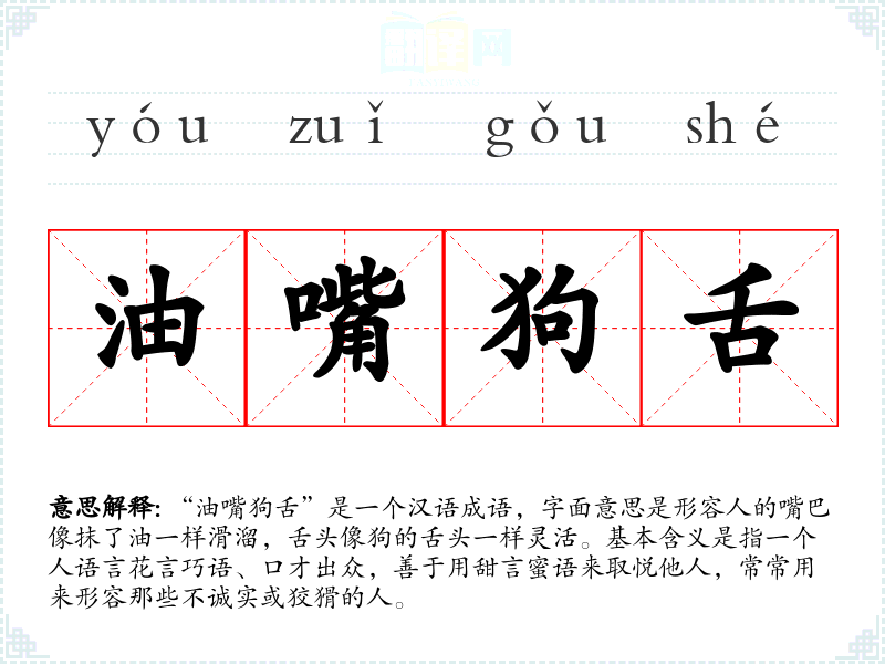 “油嘴狗舌”是一个汉语成语,字面意思是形容人的嘴巴像抹了油一样滑溜,舌头像狗的舌头一样灵活。基本含义是指一个人语言花言巧语、口才出众,善于用甜言蜜语来取悦他人,常常用来形容那些不诚实或狡猾的人。