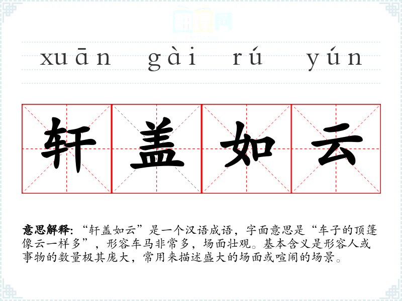 “轩盖如云”是一个汉语成语,字面意思是“车子的顶篷像云一样多”,形容车马非常多,场面壮观。基本含义是形容人或事物的数量极其庞大,常用来描述盛大的场面或喧闹的场景。