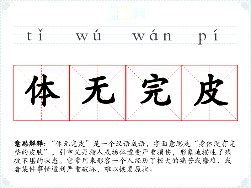 | 体无完皮 | 全身的皮肤没有一块好的。形容遍体都是伤。也比喻理由全部被驳倒,或被批评、责骂得很厉害。同“体无完肤”。 |