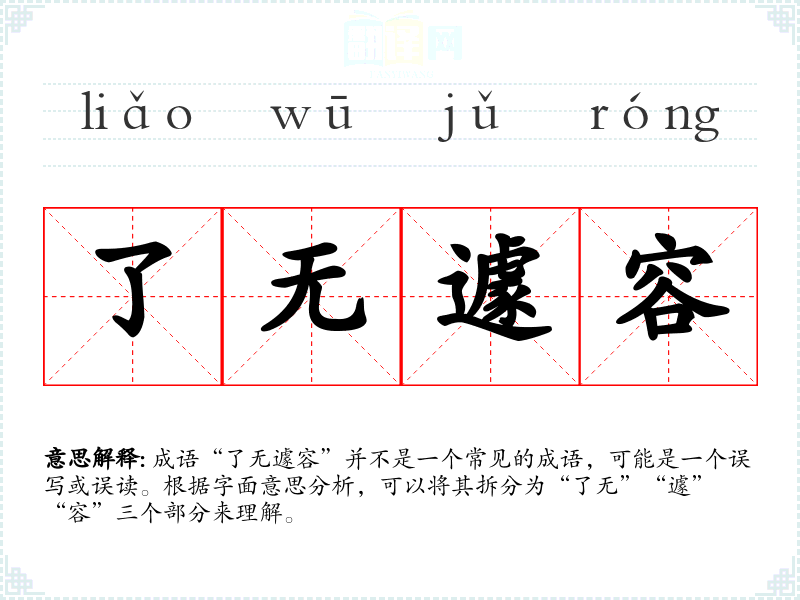 成语“了无遽容”并不是一个常见的成语,可能是一个误写或误读。根据字面意思分析,可以将其拆分为“了无”“遽”“容”三个部分来理解。