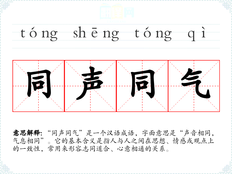 “同声同气”是一个汉语成语,字面意思是“声音相同,气息相同”。它的基本含义是指人与人之间在思想、情感或观点上的一致性,常用来形容志同道合、心意相通的关系。