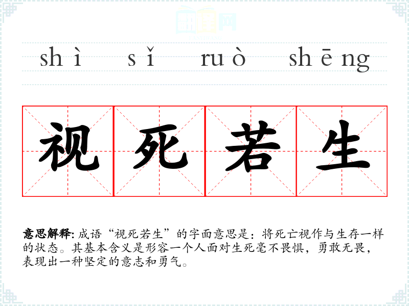 成语“视死若生”的字面意思是:将死亡视作与生存一样的状态。其基本含义是形容一个人面对生死毫不畏惧,勇敢无畏,表现出一种坚定的意志和勇气。