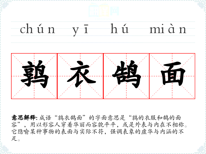 成语“鹑衣鹄面”的字面意思是“鹑的衣服和鹄的面容”,用以形容人穿着华丽而容貌平平,或是外表与内在不相称。它隐喻某种事物的表面与实际不符,强调表象的虚华与内涵的不足。