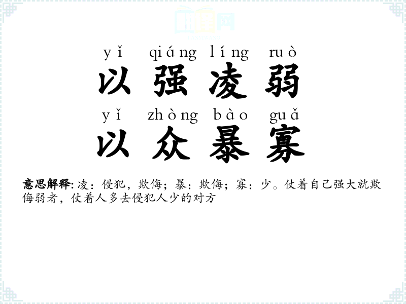 凌:欺侮。仗着自己强大就欺侮弱者。 |