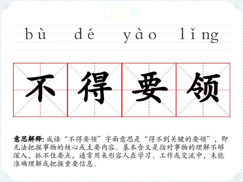 成语“不得要领”字面意思是“得不到关键的要领”,即无法把握事物的核心或主要内容。基本含义是指对事物的理解不够深入,抓不住要点,通常用来形容人在学*、工作或交流中,未能准确理解或把握重要信息。
