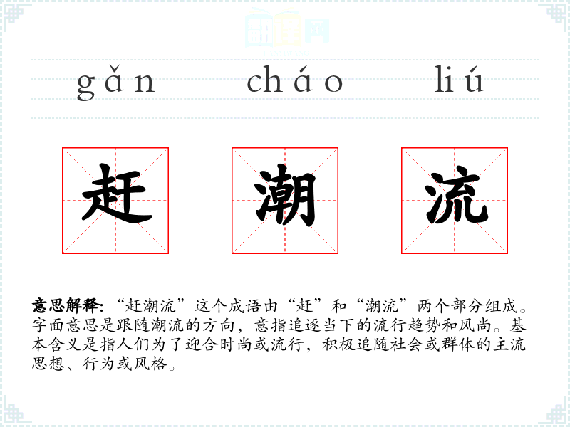 “赶潮流”这个成语由“赶”和“潮流”两个部分组成。字面意思是跟随潮流的方向,意指追逐当下的流行趋势和风尚。基本含义是指人们为了迎合时尚或流行,积极追随社会或群体的主流思想、行为或风格。