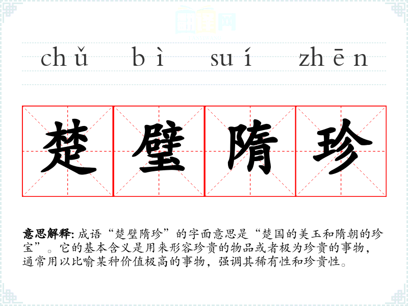 成语“楚璧隋珍”的字面意思是“楚国的美玉和隋朝的珍宝”。它的基本含义是用来形容珍贵的物品或者极为珍贵的事物,通常用以比喻某种价值极高的事物,强调其稀有性和珍贵性。