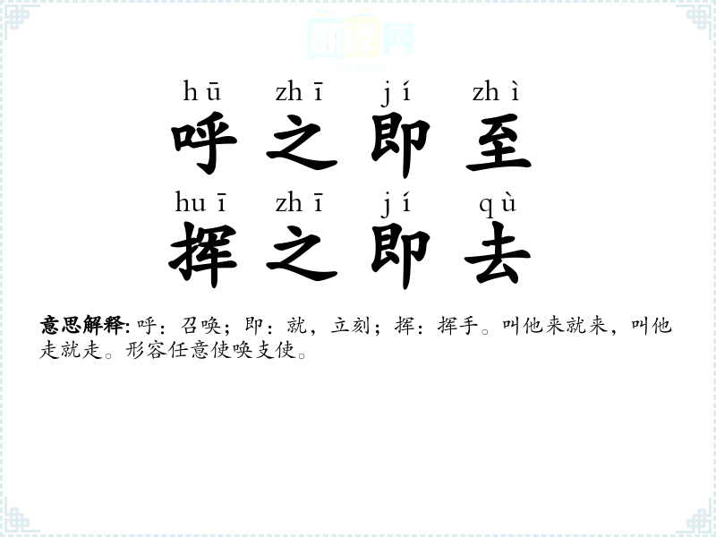 呼:召唤;即:就,立刻;挥:挥手。叫他来就来,叫他走就走。形容任意使唤支使。 |