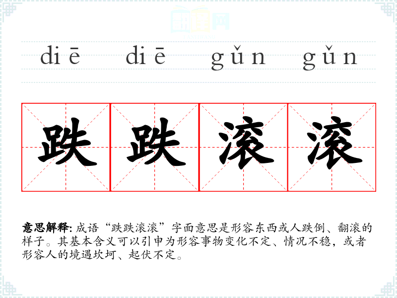 成语“跌跌滚滚”字面意思是形容东西或人跌倒、翻滚的样子。其基本含义可以引申为形容事物变化不定、情况不稳,或者形容人的境遇坎坷、起伏不定。
