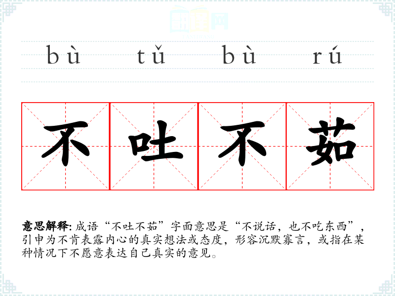 成语“不吐不茹”字面意思是“不说话,也不吃东西”,引申为不肯表露内心的真实想法或态度,形容沉默寡言,或指在某种情况下不愿意表达自己真实的意见。