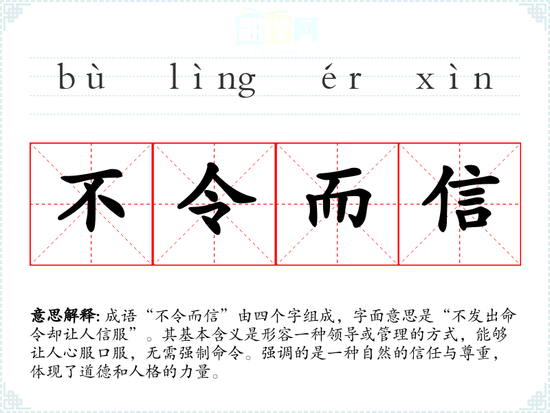成语“不令而信”由四个字组成,字面意思是“不发出命令却让人信服”。其基本含义是形容一种领导或管理的方式,能够让人心服口服,无需强制命令。强调的是一种自然的信任与尊重,体现了道德和人格的力量。
