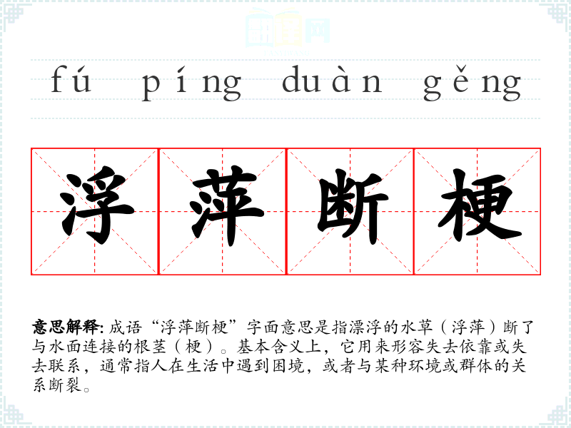 成语“浮萍断梗”字面意思是指漂浮的水草(浮萍)断了与水面连接的根茎(梗)。基本含义上,它用来形容失去依靠或失去联系,通常指人在生活中遇到困境,或者与某种环境或群体的关系断裂。